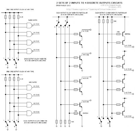 These circuits are to designed to convert the inputs from 2 SPST swiches and convert it to 4 discrete outputs. Depending on the particular circuit used, only one output can be HIGH or LOW at a time.