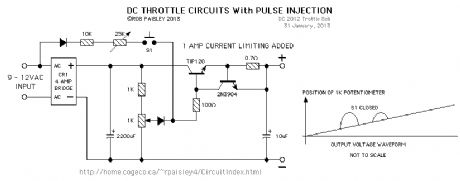 The following circuits are variations of a full wave DC throttles. The output voltage is clipped at a voltage level determined the 1K potentiometer so that the waveform is flat for most of the cycle. These throttles have good slow speed operation for typical DC motors.