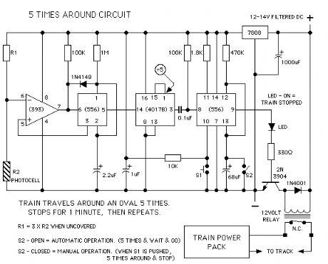 The 5 Times Around circuit was designed to automatically let an N Scale locomotive and car travel around a loop 5 times and stop for approximately a minute and then repeat the cycle. The loop of track was set up as an amusement park type of ride in the trolley section of The London Model Railroad Group's, 'O' scale layout. The club is located at London, Ontario, Canada. (View)