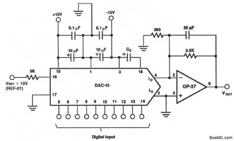 This circuit shows the classic DAC/op-amp combination that produces a digital D/A converter. VOUT is selected, in steps, by the binary signals at the digital input of DAC-10, with the highest VOUT set by VREF at pin 16. VREF is supplied by REF-01 (Fig.4-1). With the circuit assembled using the values shown (0.01 μF is typical for CC), apply binary inputs (typically -VS to -VS plus 36 V) at pins 5 through 14, stating with all zeros (or all 1s). Notice that VOUT varies (in steps) between 0 and a typical 9.9 V. Record actual values. Raytheon Linear Integrated Circuits, 1989, p. 495. (View)