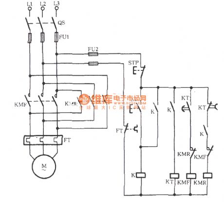 When braking, you should press the stop button STP, then AC contactor KMF (or KMR, KMF is forward contactor, KMR is the reverse contactor, 1SA, 2SA are the trip switches) loses power and releases, the motor M leaves from the AC power supply, and the normally closed contact KMF or KMR restores closed state, and KM coil gets electric and pulls in, and the main contacts close, then AC is added to the M stator windings by the main contact of KM and rectified into DC by the rectifier diodes VD1, VD2 to make motor brake quickly. At this time, due to KMF's (or KMR) normally open auxiliary contact is disconnected, the time relay KT coil is energized.