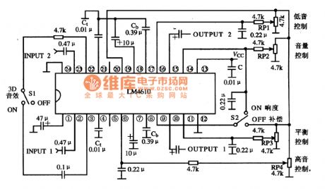 Typical applied circuit diagram of LM4610 integrated circuit is shown in the following picture. The LM4610 circuit uses 4 potentiometers MU-M as bass control, volume control, treble control and balance control respectively.