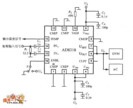 The typical application of AD8318 is as shown in the figure. The AD8318 is designed to measure the 8GHz RF power, so the insulativity of the IN+, IN- pins and functional unit circuits is very important. The positive power supply port UPSI and UPSO must be connected to the same voltage, the UPSI port supplies the bias voltage to the input circuit, the UPSO port supplies the bias voltage to the low-noise output driver of the UOUT port. There are some independent public places in the AD8318. The CMOP can be used as the public place of the output driver. All the public places need to connect with the low impedance PCB ground area.