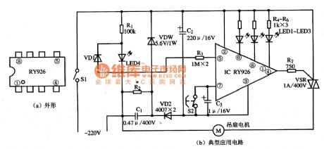 RY926 is the ceiling fan speed governing integrated circuit, which is widely used in the program control circuit of the ceiling fan and power adjusting and automatic light adjustment control of a variety of small household appliances. 1. Pin functions and data RY926 IC uses 8-pin dual in-line package, the pin functions and data are listed in Table. 2. The typical application circuit The ceiling fan speed control system typical application circuit composed of RY926 IC is shown as the chart.   (View)