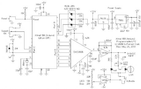 This project uses an Arduino microprocessor and a DAC0808 8 bit parallel DAC to produce arbitrary low frequency oscillator (LFO) waveforms. These waveforms are useful for driving a tremolo/vibrato circuit in a guitar amplifier such as the Lil Tiger or a phaser effect such as the Liquidator. The second version of this project improves on this design by using a serial DAC chip and an analog speed control. The initial version of this project was build using the Arduino Diecimila development board and an Arduino prototype shield for the DAC and associated parts. The original assembly can be seen in the photographs of the Lil Tiger project. The second generation version (as shown in the schematic) was built using just the Arduino's Atmega 126 processor chip on a stand-alone circuit board. The microprocessor should be programmed on the Arduino board then moved to the standalone LFO board. The circuit is a descendent of my older waveform generator project.   (View)
