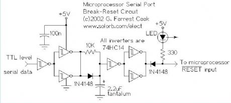 This circuit allows a remote microprocessor to be reset by a controlling host by sending a break signal over an RS-232 or RS-422 serial line. If the remote machine resets into a simple program loader program, it is possible for the host to halt and restart, or halt and reload/restart the remote machine's program. This is an ideal way to develop software on older EPROM-based systems. Modern EEPROM/NVRAM systems use JTAG interfaces for similar results. The remote processor runs its target code out of RAM, allowing the code to be updated easily. The circuit is usually used for developing code on a target processor, but it can also be used for permanent applications where the target program lives on a host system's disk. This system was once used to load code into a microprocessor-based satellite receiving system in Hawaii from a host system in Colorado using an Internet-based remote serial communications program.   (View)