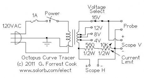 This project involves the construction of a low-cost curve tracer that is suitable for testing a wide variety of electronic components both in-circuit and out of circuit. It is easy to construct and extremely useful for finding defective parts, especially semiconductors, in electronic devices. The octopus is used in conjuction with an oscilloscope set to display in X-Y mode. It displays voltage across the test probes on one axis and current through the probes on the other axis. A scope with both Horizontal and Vertical inputs (X-Y mode) is required. This is my version of a circuit that has been around since at least the 1960s, I added the ability to select voltage taps on the filament transformer and adjust the amount of current through the probes.   (View)