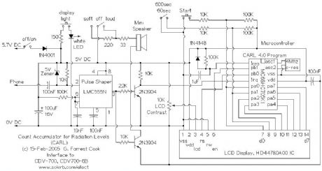 The CARL device is an add-on numerical counter that plugs into the headphone jack of 1960s vintage geiger counters such as the Victoreen CDV700 and CDV700-6B. It should also work with the Lionel ENI/LENi counters, and any other geiger counter that has a headphone output pulse greater than -5V. Vintage 1960s era geiger counters don't actually count, they use an analog meter with an integrator circuit to give short-term averaged readings of radiation detections (clicks). The CARL circuit keeps track of the total number of clicks for a period of either 60 or 600 seconds (1 or 10 minutes). This provides a way to get a long-running count of low-level radiation from sources such as radon gas, rock samples and background radiation. The CARL circuit allows for the measurement and comparison of radioactive sources that are of levels that don't produce measurable readings on analog geiger counter meters. In my Colorado location, the CARL counter shows background radiation levels of 15-20 clicks per minute upstairs and 20-25 clicks per minute in basements where radon gas is present. As a collector of rocks, my interest in making this device was to find all of the radioactive minerals in my collection, and remove them from my living space. I found quite a few rocks that registered above the background level, fortunately, I did not find anything super-hot. I have also used the meter to compare background levels in various geographical locations.   (View)