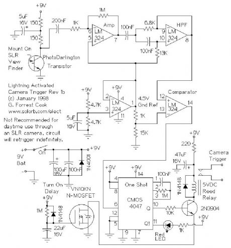 In a nutshell, the photo darlington converts light pulses into electrical pulses, the first LM324 section amplifies the electrical pulses, the second LM324 section is a high pass filter that only passes quick changes (lightning). The third LM324 stage is a comparator that allows only large pulses to pass through, and the 4047 one-shot stretches out the length of the pulses so that they are long enough to drive the relay and trigger the camera. The 2N3904 drives the reed relay, which in turn triggers the camera's electronic shutter switch. The VN10KM prevents the circuit from triggering the camera when it is first turned on. The LM324 GND Ref circuit divides the 9V power into two for a 4.5V ground reference. The other op-amp circuits use this reference value.   (View)