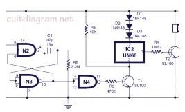 Here the circuit diagram of musical bell with touch switch and timer. This circuit is designed around CMOS IC CD4011 which work as the delay timer and IC UM66 which is well-known musical sound generator. When touch plates are bridged (touched) by hand for a moment, the circuit will start to produce music sound. Just after a short period (few seconds), the musical sound from this circuit will automatically stop.   (View)
