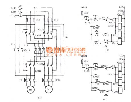 Figure (a) shows the main circuit; Figure (b) is a control circuit of M1 ; Figure (c) is a control circuit of M2. Motor M1 is controlled by KM11, KM12, KM13 and KT1; motor M2 is controlled by KM21, KM22, KM23 and KT2. In order to ensure two electric motors can start at the different time, it is setting the interlock circuit.