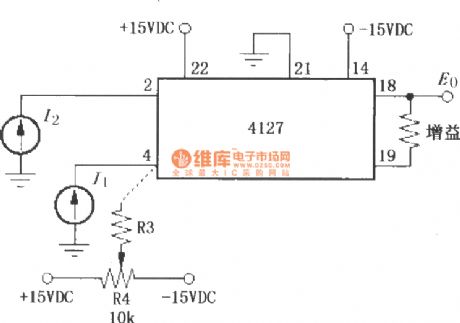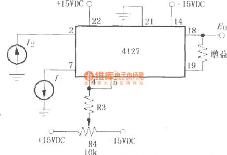 As shown in figure, it is the output logarithmic transformation function circuit with the signal I1 being negative, I2 being positive and input with current form. When the input I1 flows to 4127's 7feet and I2 flows to 2 feet as the directionshown in figure,output voltage E0 = - A · log ( I1/I2 ), then output is converted into logarithmic form.