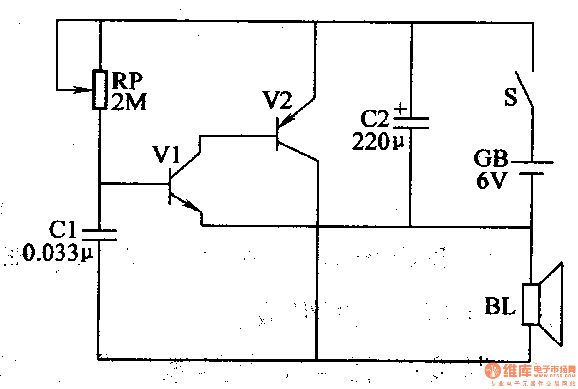 This example describes the seedlings growth stimulator in seedling house,and it is set in the middle of the seedling house which is based on that plants are more sensitive to low-frequency pulse.Thus,users can stimulate the seedlings with its low-frequency pulse,and promote the growth of seedlings.Users can test a small area first, and then put into operation based on the practical situation. The principle of circuitThis seedlings growth stimulator circuit consists of transistors V1,V2,potentiometer RP,capacitors C1,C2,speaker BL,battery GB and power supply switch S which is shown in figure 4-209.