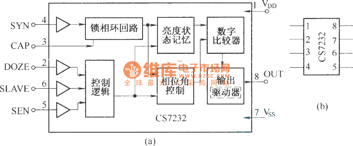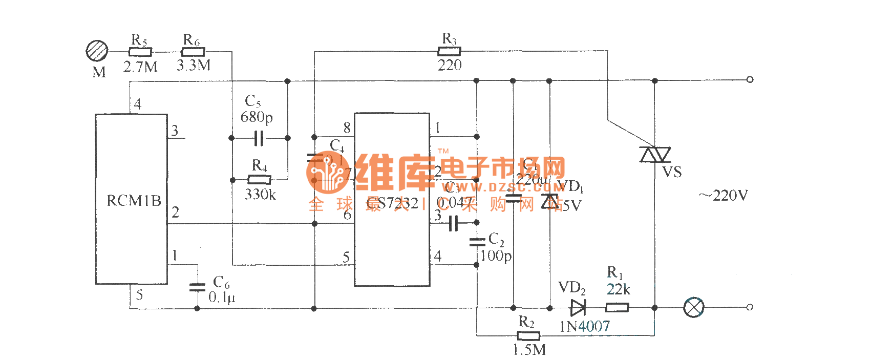 Wireless remote control/touch dimmer circuit is an incandescent lamp dimmer switch with wireless remote control component RCM1A/RCM1B and touch dimmer integrated circuit CS7232 as the core. It can be used to control droplight, reading lamp and wall lamp etc, provided with small bulk, convenient usage, stable and reliable work characteristics.CS7232 is a CMOS type integrated circuit used to control incandescent lamp dimmer. It can control breakover of bidirectional thyristor to realize lamp brightness control, provided with low power loss, multi purpose , high sensitivity etc characteristics.