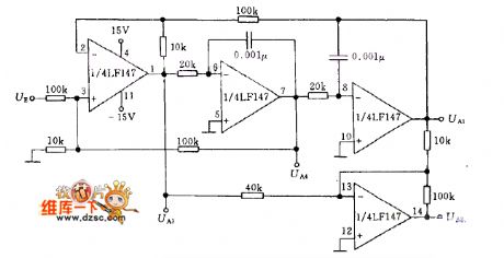The circuit is as shown, the new frequency fo=3.4KHz, the notch frequency fo=9.5KHz, the quality factor Q=3.4. For high frequency filter, the transfer coefficient is 0.1, for band-pass filter, it is 1, for low frequency filter, it is 1, for notch filter, it is 10. foQ≤200KHz, when the output sine signal is within 10V, the maximum frequency is no more than 200KHz.