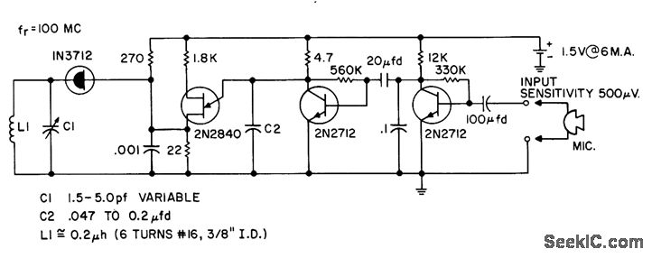 Signal picked up by microphone is amplified by first 2N2712, which turns off second 2N2712, allowing C1 to charge up and ire 2N2840 unijunction oscillator, producing pulse that modulates tunnel-diode transmitter.- Transistor Manual, Seventh Edition, General Electric Co., 1964, p 362.