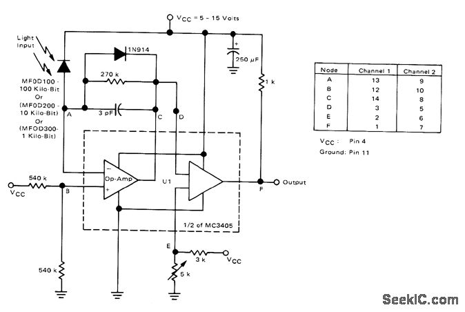 Choice of input device determines operating speed of receiver. MC3405 contains two opamps and two comparators, permitting use as two-channel receiver. Table gives pin connections foi each channeL- Basic Experimental Fiber Optic Systems, Motorola, Phoenix, AZ, 1978.
