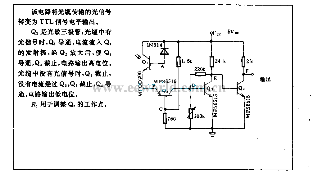 This circuit turns theoptical signal transmitted by optical cable to TTL signal level output.