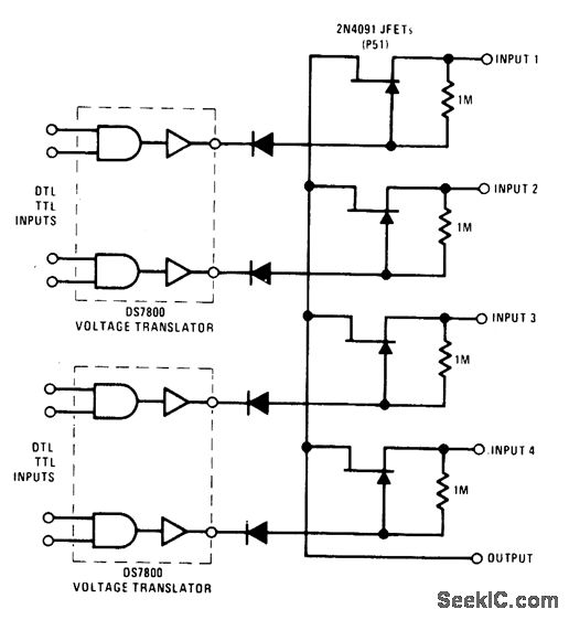 This 4-channel commutator used the 2N4091 to achieve low channel on resistance (<30 ohm) and low off current leakage. The DS7800 voltage translator is a monolithic device that provides from 10 V to -20 V gate drive to the JFETs while at the same time providing DTL/TTL logic compatibility.