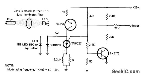 Uses pulse-rate modulation system with center frequency of 50 kHz. Audio fed into transmitter varies pulse rate, for driving LED coupled to optical fiber. Phototransistor at other end of fiber receives and demodulates light signal for reconstruction of audio.-I. Math, Math's Notes, Ca July 1977, p 67-68 and 90.