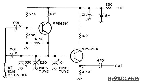 Developed for use as separate VFO control for transmitting and receiving frequencies in amateur transceiver. Capacitors marked M should be mica. Fine-tuning control covers ±20 kHz range. Will operate almost anywhere in HF range with appropriate change in coil. Output is 4 V P-P.-An Accessory VFO-the Easy Way, 73 Magazine, Aug. 1975, p 103 and 106-108.