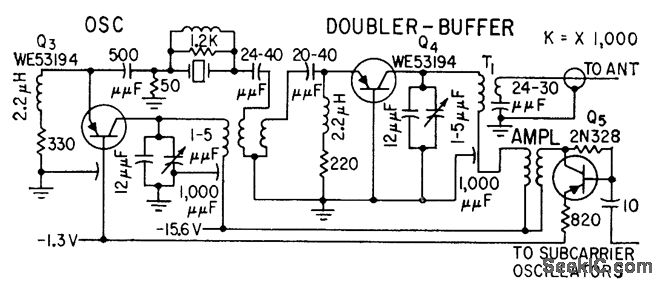 Amplitude modulation is applied at collector of amplifier-doublet Q4.-H. L. Richter et al., Instrumehting the Explorer I Satellite, Electronics, 32:6, p39-43.