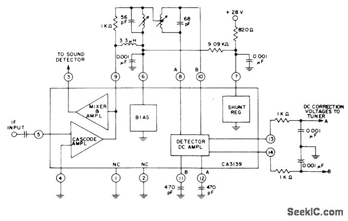 RCA CA3139 automatic fine tuning IC combined with intercarrier mixer/amplifier for color and monochrome receivers provides AFT voltage for tuner correction and amplified 4.5-MHz intercarrier sound signal for external FM sound detector of receiver. Input is taken from output of IF amplifier in receiver.- Linear Integrated Circuits and MOS/FET's, RCA Solid State Division, Somerville, NJ, 1977, p381.