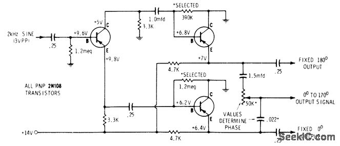 Developed for testing chroma demodulator in color TV receiver. Audio oscillator is used as source of sine waves. First stage is phase inverter, followed by two emitter-followers. Resulting output signals of opposite phase are combined through a small capacitor (0.022μF, selected for frequency used) from one channel and 50K variable resistor from other channel. 90°phases are judged by position of sine waves on screen of CRO; 90° is halfway between 0° and 180°.-C. Babcoke, Waveforms Explain Chroma Demodulators, Electronic Servicing, Sept. 1972, p 22-23, 26-28, and 30.