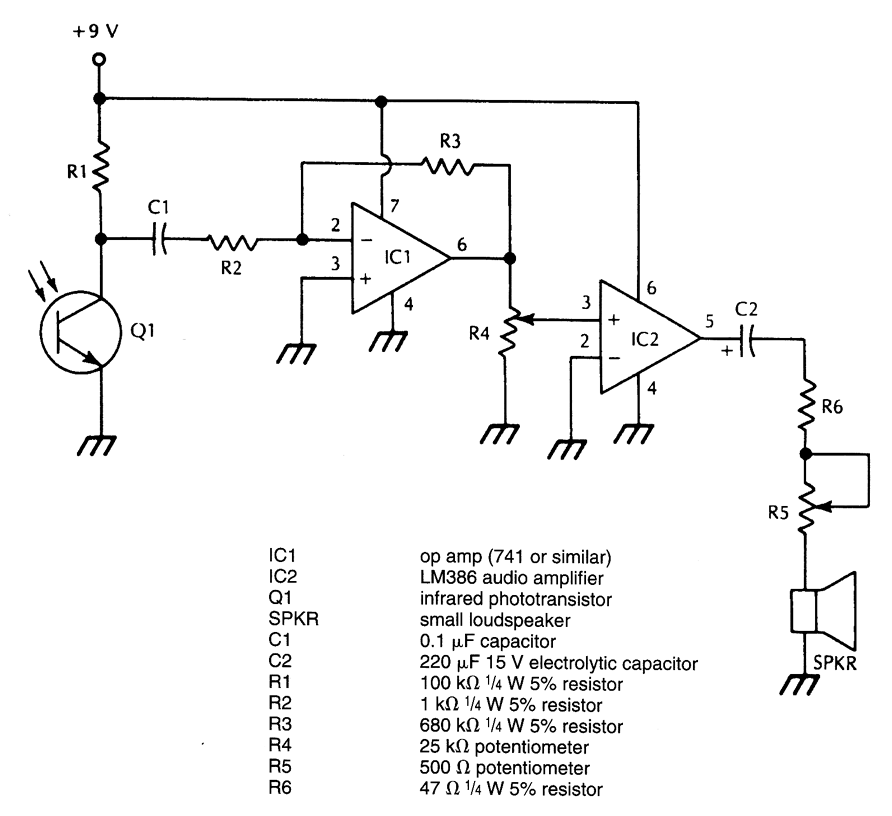 This receiver is designed to demodulate amplitude-modulated (AM) IR light beams and will drive a loudspeaker. R5 is an auxiliary volume control and it could be omitted. Q1 should be suitably mounted and shielded from stray light pickup.