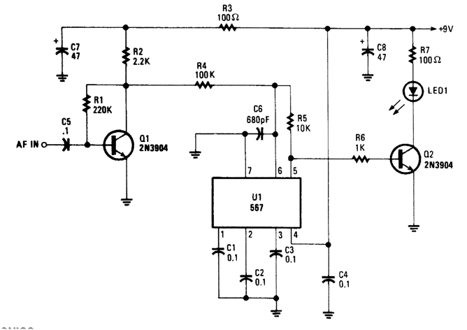 This circuit produces an effect similar to frequency modulation (FM) by varying the voltage at pin 6 of the PLL using an audio signal. The FM 1R signal can be picked up by a receiver with an FM detector suitably tuned.