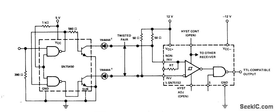 Transmits data at rates up to 0.5 MHz over twisted pair to Texas Instruments SN75152 dual-line receiver. Other section of receiver is identical and can handle additional twisted-pair input. Diodes in lines are required only for negative common-mode protection at driver outputs. System has high common-mode voltage capability. SN75450 is dual peripheral driver for high-current switching at high speeds.- The Linear and Interface Circuits Data Book for Design Engineers, Texas Instruments, Dallas, TX, 1973, p8-78.