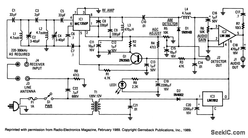 IC1 is again block i-f chip that has AGC capability and approximately 60 dB of gain. Components C8, C9, and L3, which are placed across the output of IC1, are broadly resonant around 280 kHz. C10 couples rf to detector-diode D1, which is used as an envelope detector.