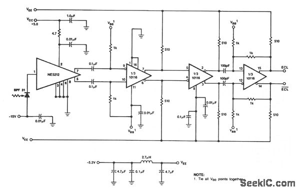 This receiver uses the NE5212, the Signetics 10116 ECL line receiver, and the Phillips/Amperex BPF31 pin diode. The circuit is a capacitor-coupled receiver and utilizes positive feedback in the last stage to provide the hysteresis. The amount of hysteresis can be tailored to the individual application by changing the values of the feedback resistors to maintain the desired balance between noise immunity and sensitivity. At room temperature, the circuit operates at 50-M baud with a BER of 10E-10 and over the automotive temperature range at 40-M baud with a BER of 10E-9. Higher speed experimental diodes have been used to operate this circuit at 220-M baud with a BER of 10E-10.