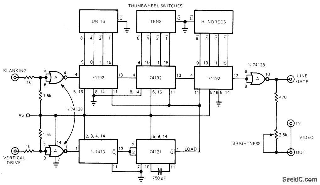Three thumbwheel switches connected in binary mode control three 74192 counters、for selection of any desired line up to 999 in television field. Line-gate pulse injects into looped-through video for brightening selected line to make it visible on display. Circuit can also be used to determine exact number of active lines in each television field,Article describes operation in detail-H F,Stearns、Build a Thumb-wheel-Switched Television Line Selector, EDN Magazine, June 20,1976, p 124,