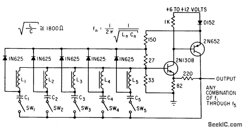 Two-transistor circuit generates up to five different tones simultaneously for five-bit parallel encoder for telemetry. Starting transients ore built up in individual series-tank circuits. Amplitude of oscillation stabilizes al value where energy from negative-resistance source equals energy lost in tanks.-R. Stapelfeldt, Multitone Oscillators-New Source of Simultaneous Frequencies, Electronics, 36:1, p 86-87.
