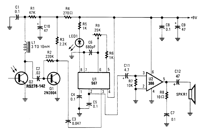 Modulated IR energy strikes Q2, a phototransistor. Q1 is a tunde amplifier,and feeds PLL detector U1.U2 is an audio amplifier that drives a speaker.