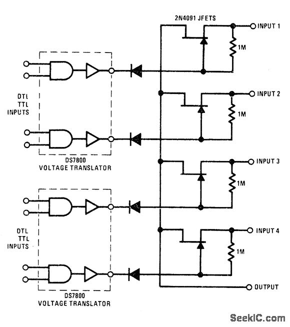 2N401 JFETs give ON resistance of less than 30 ohms for each channel along with low OFF current leakage, DS7800 voltage translators provide gate drives of 10 V to -20 V for JFETs while giving DTL/TTL compatibility, - FET Databook, National Semiconductor, Santa Clara, CA, 1977, p 6-26-6-36.