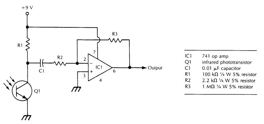 Suitable for amplitude-modulated IR beams, this receiver provides an audio signal that corresponds to the modulation envelope. Phototransistor Q1 should be properly mounted and shielded from stray light. This receiver should drive a small earphone dire