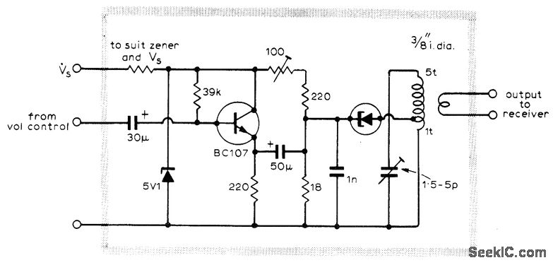 AF signal from volume control of TV receiver is converted to FM signal by using BC107 transistor to frequency-modulate tunnel-diode oscillator operating within FM broadcast band. Oscillator output is fed through air-core transformer and coaxial line to FM receiver of high-fidelity sound system. Arrangement eliminates most of distortion introduced in power amplifier and loud-speaker of average TV set. Use shielding to keep unwanted FM radiation at minimum.-A. J. Smith, Improving Television Sound, Wireless World, Aug, 1973, p 373.