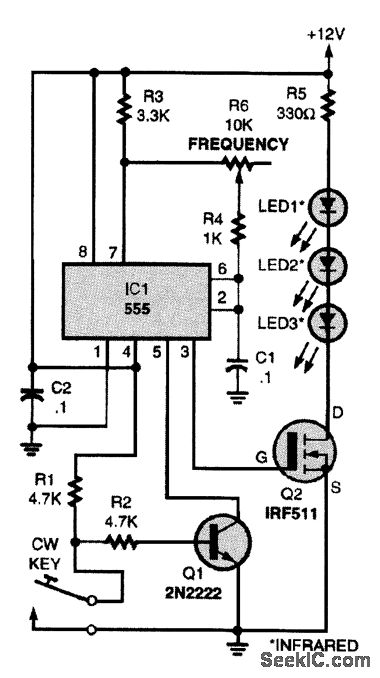 A 555 timer, IC1, is connected in an audio-oscillator circuit with its frequency set by potentiometer R6. Transistor Q1, with the CW key up, is biased on, thereby holding pin 5 of IC1 low and keeping it turned off. The 555 timer's output, at pin 3, ties to the gate of a power hexFET, Q2, which drives the three IR emitters, LED1 to LED3. Placing the CW key in the down position turns the 555 oscillator on. That sends out the audio tone signal via IR.