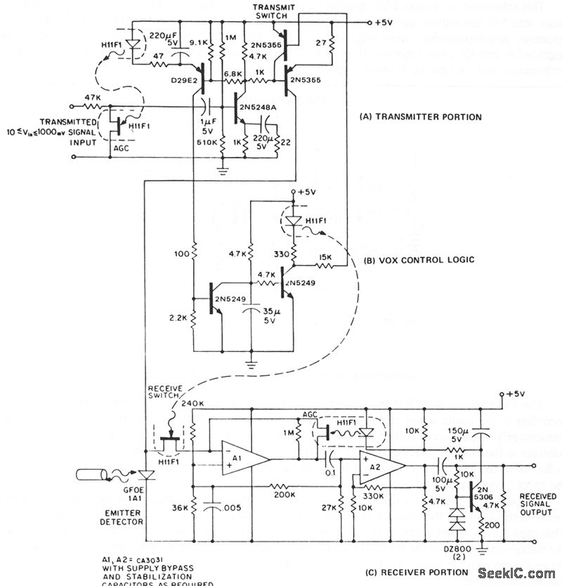 In a half-duplex system, information can flow in both directions, but only one direction at any given time. The conventional method of building a half-duplex link requires a separate emitter and detector, connected with directional couplers, at each end of the fiber. The GFOEIA series of infrared emitting diodes are highly efficient, long-lived emitters, which are also sensitive to the 940 nm infrared they produce. Biased as a photodiode, they exhibit a sensitivity of about 30 nA per μW irradiation at 940 nm. In a suitable bias and switching logic network, they form the basis for a half-duplex information link. A half-duplex link, illustrating the emitter-detector operation of the GFOE1A1, is shown.This schematic represents a full, general purpose system, including: approximately 50-dB compliance range with 1-V rms output, passive receive, voice-activated switching logic, 100 Hz to 50 kHz frequency response, and inexpensive components and hardware. The system is simple, inexpensive, and can be upgraded to provide more capability through use of higher gain bandwidth amplifier stages. Conversely, performance and cost can be lowered simply by removing undesired features.