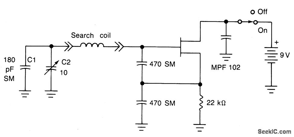 The search coil, C1 and C2 form a tuned circuit for the oscillator which is tuned near the center of the broadcast band. Tune a portable radio to a station near the middle of the band, then tune C2 until a squeal is heard as the two signals mix to produce a beat (heterodyne) note. Metal near the search coil will detune the circuit slightly, changing the pitch of the squeal. The search coil is 20 turns of number 30 enameled wire, wound on a 6 x 8 wood or plastic form. It is affixed at the end of a 30 to 40 wooden or plastic pole, and connected to the remainder of the metal detector circuit through a coaxial cable.