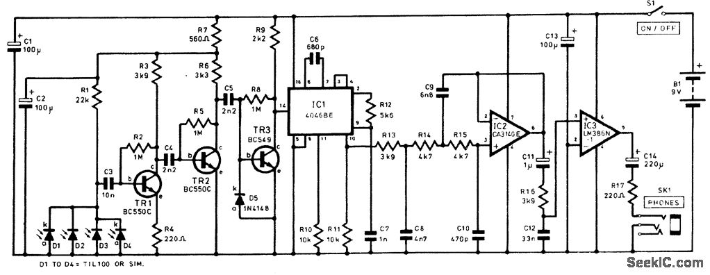 The full receiver circuit diagram appears in the figure. As many as four infrared detector can be used (D1 to D4 ). They are wired in parallel and used in the reverse-biased mode, and dark conditions only very small leakage currents flow. The pulses of infrared from the transmitter result in increased leakage currents, which generate small negative pulses at the cathodes (k) of the diodes. Transistor TR1 is used as a low-noise preamplifier and buffer stage. The majority of the voltage gain is provided by transistors TR2 and TR3, which are also common-emitter stages. These provide a combined voltage gain of over 80dB. The signal from TR3 is connected to one of the phase comparator inputs of IC1 (pin 14 ). This IC provides demodulation and is a CMOS 4046BE p.l.d. Resistor R10 and capacitor C6 are the timing components for the VCO,and they set the center frequency at approximately 100 kHz. Resistor R10 and capacitor C7 form a simple low-pass filter between the phase comparator’s output at pin 2 and the input of the VCO at pin 9. The audio output signal is obtained from the low-pass filter via an integral source-follower stage. The output from IC2 is fed to resistor R16 and capacitor C12, which form a simple low-pass filter that provides the deemphasis. The signal is then fed to the input of IC3, which is a small class-B audio power amplifier. The current consumption of the receiver is about 12 mA.