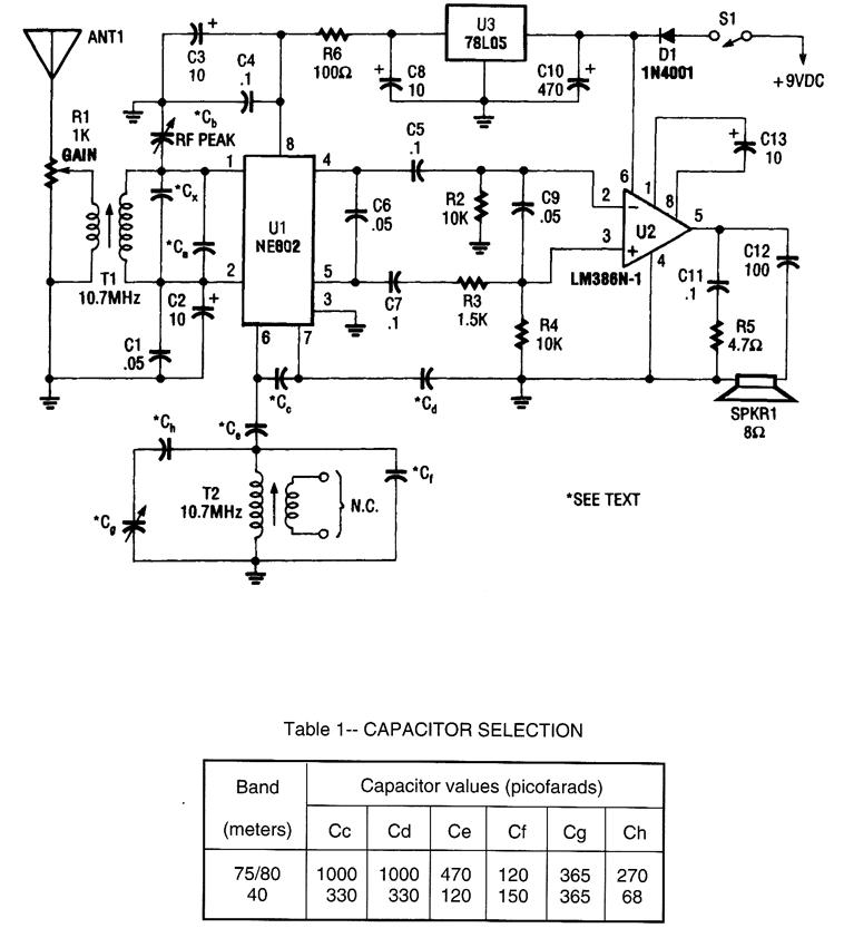 An NEC602 is used as a mixer with a zero IF frequency output. U2 acts as an audio amplifier. This receiver is primarily for SSB and CW signals. T1 and T2 are 10.7-MHz IF coils used in AM/FM transistorized radios, etc. or in any similar indicator.