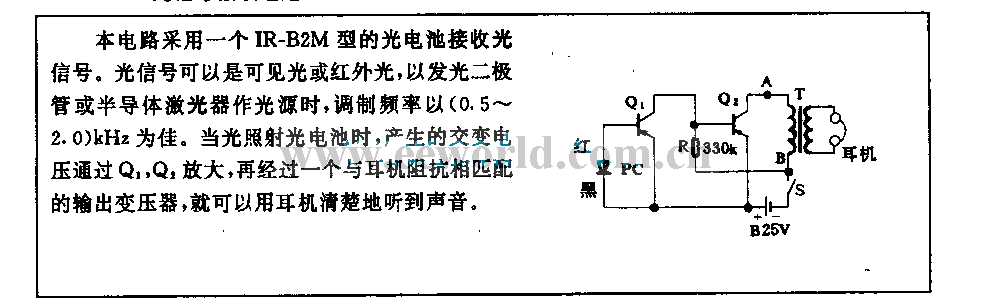 This circuit adopts a IR-B2M type photoelectric cell to receive optical signal. The optical signal can be visible light or infrared light, when it uses LED or semiconductor laser as light source, the best modulation frequency is 0.5~2.0kHz. When the light shines on photoelectric cell, the produced AC voltage is amplified by Q1, Q2, you can clearly hear the sound with a earphone, after a transformer which is fitting with the earphone resistance.
