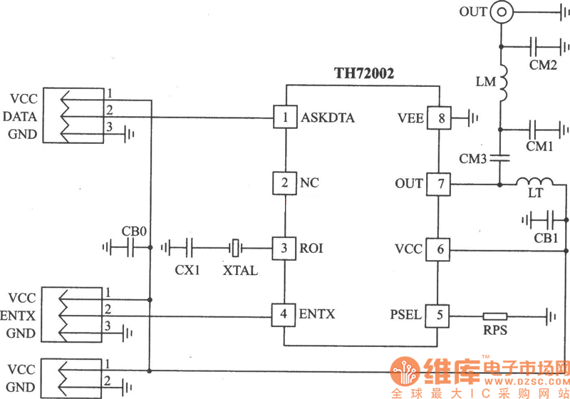 TH72001 is a single-chip transmitter chip, designed with a standard line with EN 300220 and some similar standards. It can be used in keyless entry systems, remote telemetry systems, data communications systems and security and other systems. The main technical characteristics are as follows: • Operating frequency is 290 ~ 350 MHz; • Single-ended RF output; • FSK modulation; • FSK modulates through crystal pulling and FSK modulates at rate of DC ~ 40 Kb / s;• Power supply is l .9 ~ 5.5 V; • Operating current is 3.5 ~ 10.7mA and standby current is 0.1μA; • Output power is adjustable within -15 ~ +6 dBm.