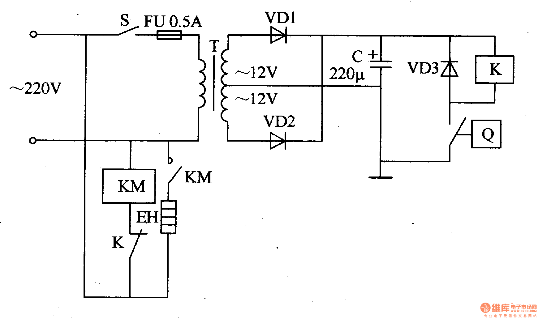 Power circuit consists of power switch S, fuse FU, power transformer T, a rectifier diode VDl, VD2 and filter capacitor C.