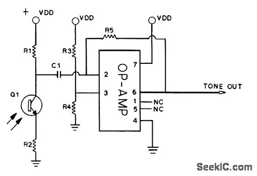 This receiver uses an op amp and a phototransistor as a recetver for IR signals. Q1 is a phototransistor. The op amp is CMOS or FET, such as a TL081, etc. R1 and R2 depend on phototransistor, but are typically 2.2 kΩ and 330Ω, respectively. R3=R4=10 kΩ, R5=100 kΩ, and C1 is 0.1 μF (or larger ).
