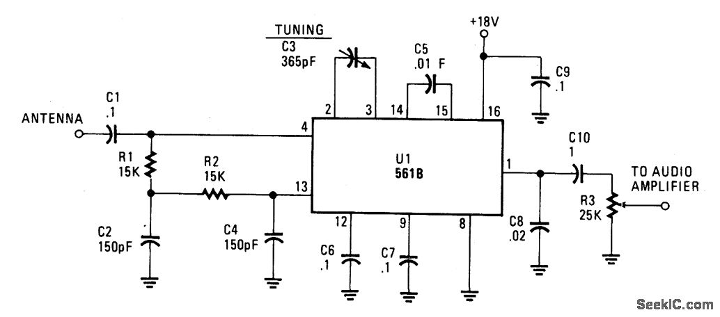This simple AM circuit uses a 561B. There's no inductance/capacitance tuning circuit.The 365 pF capacitor connected between pins 2 and 3 does a11 the tuning. The circuit needs a good outside antenna and a solid ground. And if you want to further improve operation, stick a broadband amplifier in front of the receiver. Just make sure the input voltage does not climb over 0.5 volt rms.