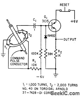 Toroid in control electrode circuit of solid-state thyratron Q1 triggers circuit on when command pulse passes through insulated conductor, without affecting command circuit for such critical functions as arming of missile.-R. C. Wright, Collecting Data from Live Missiles in Flight, Electronics, 34:12, p 46-49.